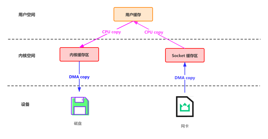 接着用户程序将用户态 Buffer 再拷贝到内核态(CPU copy)。