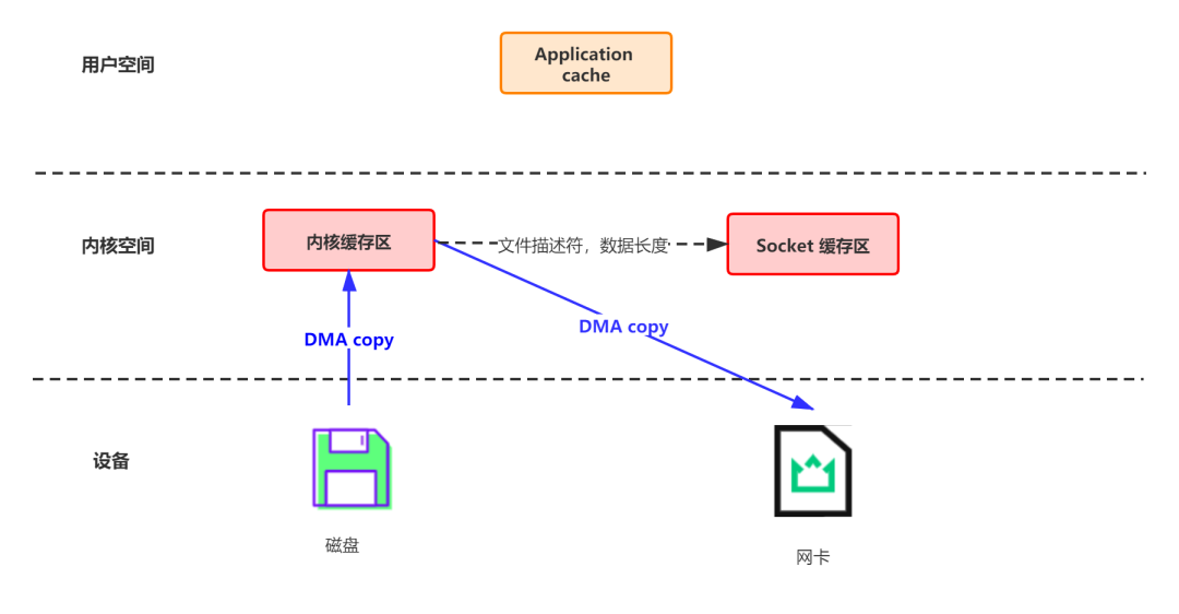 Linux 2.4+ 内核通过 Sendfile 系统调用,提供了零拷贝。数据通过 DMA 拷贝到内核态 Buffer 后,直接通过 DMA 拷贝到 NIC Buffer,无需 CPU 拷贝。这也是零拷贝这一说法的来源。