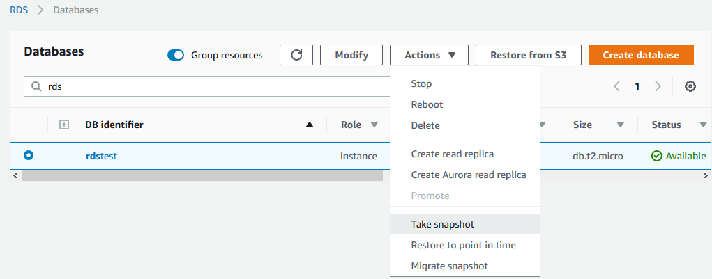 2)对源数据库创建快照,可以使用图形界面进行操作,选中要迁移的数据库实例,Actions 下来菜单中选择 Take snapshot,如下图所示: