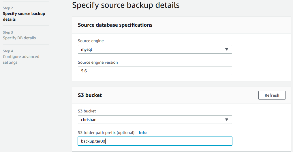 a. 在 RDS 控制台上选择 Restore from S3 按钮