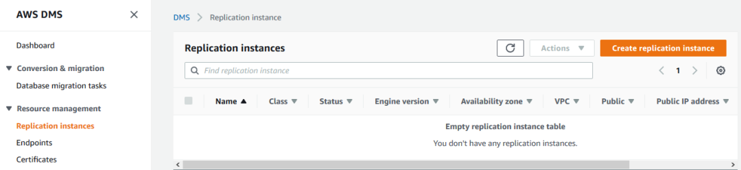 在 AWS DMS 的主页上,选择 Replication instances,然后在右边点击 Create replication instance 按钮。在显示的界面上输入 DMS 实例相关的一些信息,比如实例名称,实例大小等。需要注意的是,如果需要传输的数据量比较大,同时源数据库上有较大的工作压力的话,应该选择较大的机型。