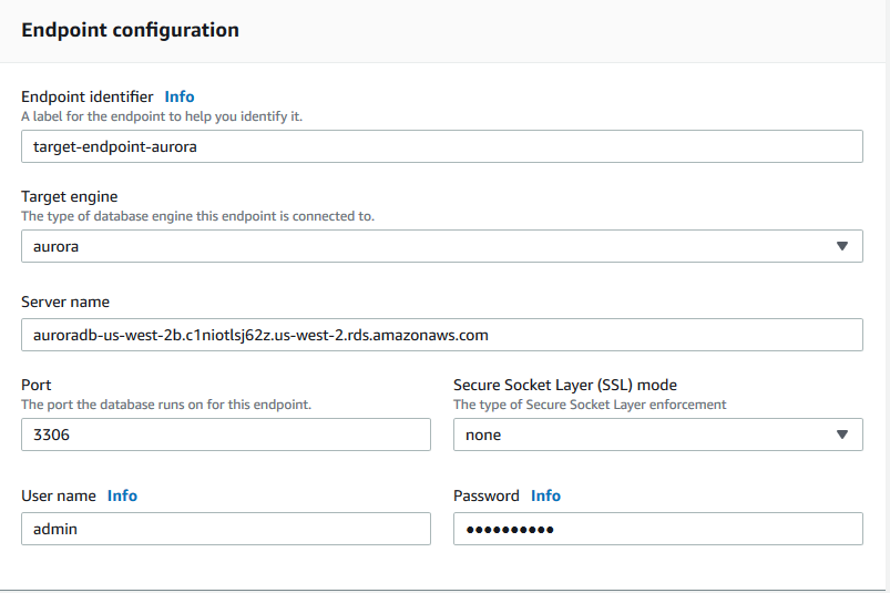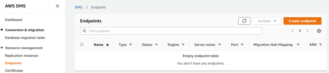 先创建一个空的、不包含业务数据的 Aurora 数据库作为目标库,然后创建一个类型为 target endpoint、并指向该 Aurora 数据库的 endpoint。