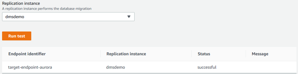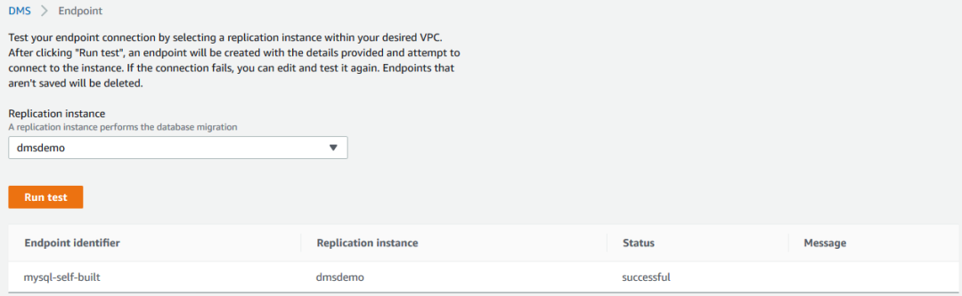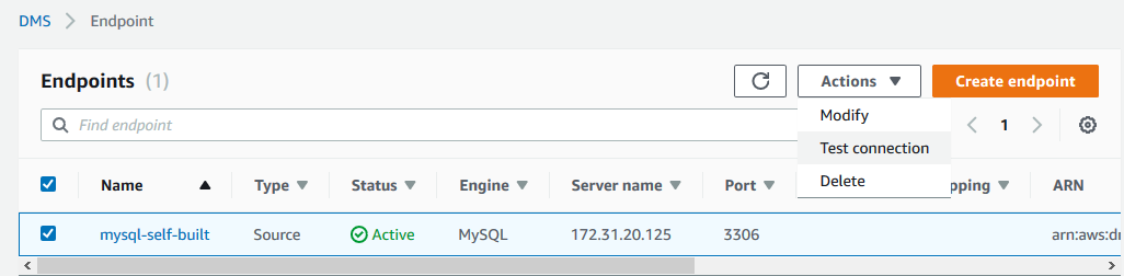 创建了 source endpoint 以后,我们可以进行连接测试: