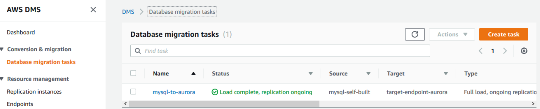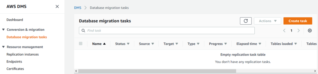 创建了源和目标 endpoint 以后,可以开始创建复制任务。选择 Database migration tasks 链接,然后选择 Create task 按钮。