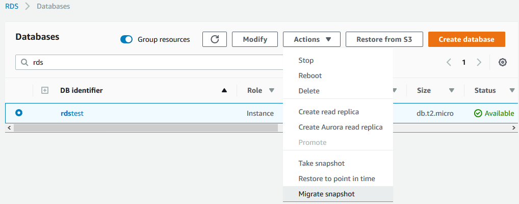 3)根据快照恢复出一个 Aurora 数据库。可以使用图形界面操作,在数据库列表中,选中之前创建快照的数据库实例,Actions 下来列表中选择 Migrate snapshot,如下图所示: