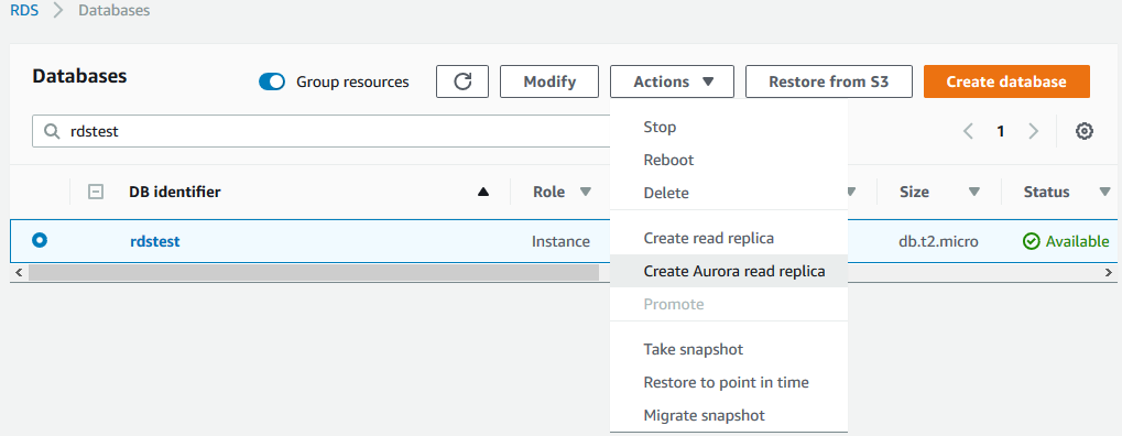 1)在控制台界面上选中要迁移的 MySQL RDS 数据库,在 Actions 下拉菜单中选择 Create Aurora read replica,如下图所示: