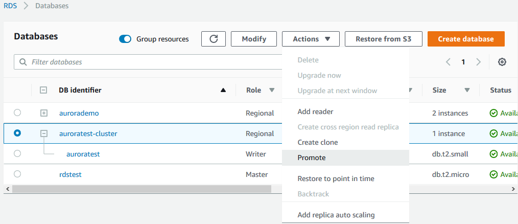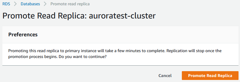 检查输出里的 Seconds_Behind_Master 字段的值,如果为 0 则表示 Aurora 读副本已经与 MySQL RDS 主库保持同步了。否则继续等待,直到该字段为 0 为止。然后选择 Aurora 只读副本,在 Actions 下拉菜单中选择 Promote 选项。