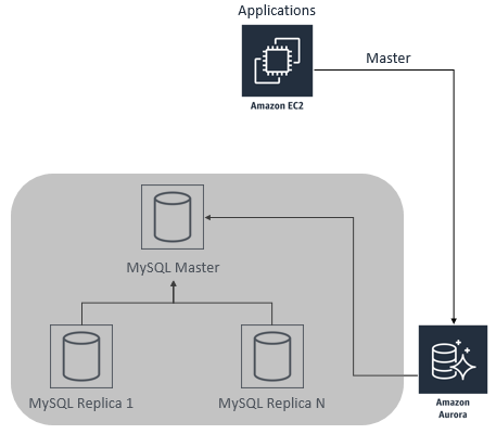 3)当需要进行切换的时候,也就是业务低谷的时候,停止应用程序在源 MySQL 数据库里的写入操作,然后等到 Aurora 从库的数据与 MySQL 主库的数据完全一致以后,修改应用程序的连接字符串,使其指向 Aurora 从库,使得 Aurora 数据库变为主要的写入数据库(如果你之前把 Aurora 数据库的 read_only 设置为了 1,则需要把其改回到 0,从而允许写入 Aurora 数据库)。而原来的 MySQL 数据库则可以被销毁。该阶段如下图所示。