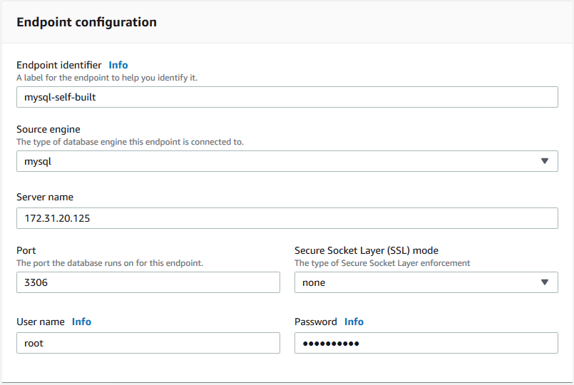 选择 endpoint type 为 Source endpoint,并指定源数据库的信息,如下所示: