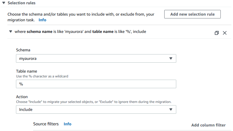 在创建任务的界面上,选择之前创建的 source endpoint 和 target endpoint,migration type 选择 Migrating existing data and replicate ongoing changes,同时选择 Enable CloudWatch logs 复选框。在 Selection rules 部分,我们指定把 MySQL 里的 myaurora 数据库的数据复制到 Aurora 里,如下图所示: