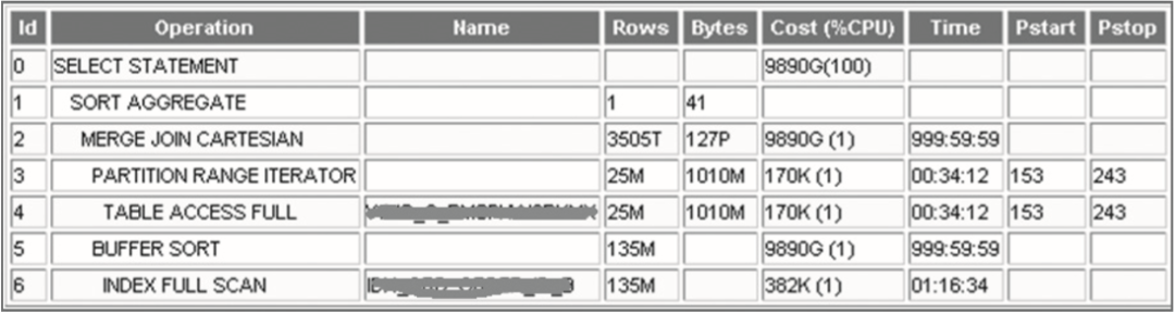 select ... from ...where( ( order_creation_date>= to_date(20120208,'yyyy-mm-dd') and order_creation_date<to_date(20120209,'yyyy-mm-dd') ) or ( send_date>= to_date(20120208,'yyyy-mm-dd') and send_date<to_date(20120209, 'yyyy-mm-dd') ))andnvl(a.bd_id,0) = 1--------------------------------------------------------------------------------| Id | Operation | Name |Cost (%CPU)| Time |Pstart | Pstop |--------------------------------------------------------------------------------| 0 | SELECT STATEMENT | | 2470K(100)| | | || 1 | SORT GROUP BY | | | | | || 2 | TABLE ACCESS BY GLOBAL INDEX ROWID | XXXX | 5 (0) | 00:00:01 | ROW L | ROW L || 3 | NESTED LOOPS | | 2470K (1) | 08:14:11 | | || 4 | VIEW |VW_NSO_1| 2470K (1) | 08:14:10 | | || 5 | FILTER | | | | | || 6 | HASH GROUP BY | | 2470K (1)| 08:14:10 | | || 7 | TABLE ACCESS BY GLOBAL INDEX ROWID | XXXX | 5 (0)| 00:00:01 | ROW L | ROW L || 8 | NESTED LOOPS | | 2470K (1)| 08:14:10 | | || 9 | SORT UNIQUE | | 2340K (2)| 07:48:11 | | || 10 | PARTITION RANGE ALL | | 2340K (2)| 07:48:11 | 1 | 92 || 11 | TABLE ACCESS FULL | XXXX | 2340K (2)| 07:48:11 | 1 | 92 || 12 | INDEX RANGE SCAN | XXXX | 3 (0)| 00:00:01 | | || 13 | INDEX RANGE SCAN | XXXX | 3 (0)| 00:00:01 | | |--------------------------------------------------------------------------------
