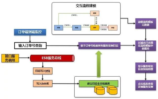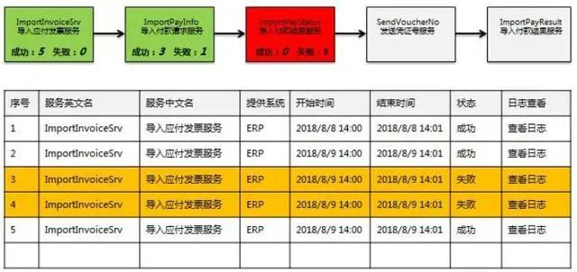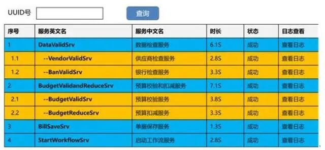 简单来说,比如一个采购订单,基于一个采购订单号,我们实际上可以通过服务监控数据来分析到该订单是否已经从采购系统导入到ERP,是否已经进行了报账申请,是否已经进行了付款等,实际上这些信息从服务实例日志中都可以提取出来。