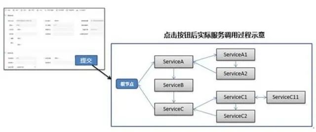即在前台功能页面,点击提交单据按钮的时候,需要调用业务内部多个服务接口,同时也需要调用到外部系统提交的服务接口,实现完整的业务功能逻辑。那就需要对整个服务调用链进行监控。