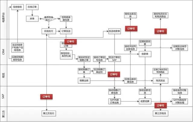 如上图,一个完整的企业内部自建电商平台,在完成一个B端客户的订单下达,执行和交付的时候,需要跨越电商平台,CRM系统,物流平台,SAP-ERP系统和第三方支付平台,第三方的物流平台来共同完成。
