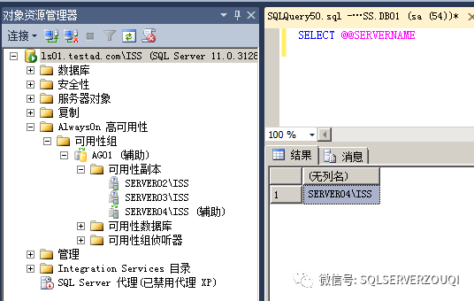 --指定在此可用性副本当前拥有辅助角色(即它是辅助副本)时要生效的角色有设置:ALTER AVAILABILITY GROUP [AG01]MODIFY REPLICA ONN'SERVER02\ISS' WITH(SECONDARY_ROLE (ALLOW_CONNECTIONS = READ_ONLY));ALTER AVAILABILITY GROUP [AG01]MODIFY REPLICA ONN'SERVER02\ISS' WITH(SECONDARY_ROLE (READ_ONLY_ROUTING_URL = N'TCP://SERVER02.testad.com:1433'))ALTER AVAILABILITY GROUP [AG01]MODIFY REPLICA ONN'SERVER04\ISS' WITH(SECONDARY_ROLE (ALLOW_CONNECTIONS = READ_ONLY));ALTER AVAILABILITY GROUP [AG01]MODIFY REPLICA ONN'SERVER04\ISS' WITH(SECONDARY_ROLE (READ_ONLY_ROUTING_URL = N'TCP://SERVER04.testad.com:1433'))--指定在此可用性副本当前拥有主角色(即它是主副本)时要生效的角色有设置:ALTER AVAILABILITY GROUP [AG01]MODIFY REPLICA ONN'SERVER04\ISS' WITH(PRIMARY_ROLE (READ_ONLY_ROUTING_LIST = (N'SERVER02\ISS',N'SERVER04\ISS')));ALTER AVAILABILITY GROUP [AG01]MODIFY REPLICA ONN'SERVER02\ISS' WITH(PRIMARY_ROLE (READ_ONLY_ROUTING_LIST = (N'SERVER04\ISS',N'SERVER02\ISS')));