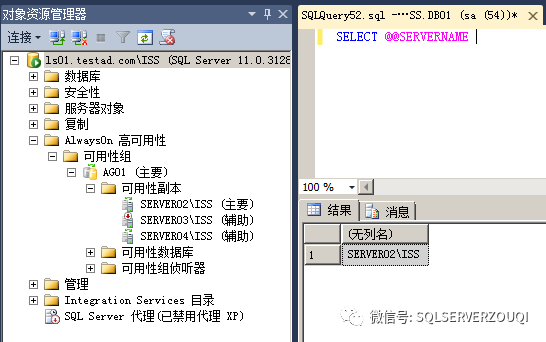 按照书中的方法,执行如下脚本(本来我是3节点的可用性组,由于笔记本开4台虚拟机实在是太卡,我把server03给关掉了,只读路由也没配置这个节点。):