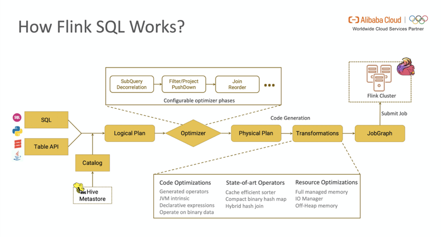 Flink SQL 利用 Apache Calcite 将 SQL 翻译为关系代数表达式,使用表达式折叠(Expression Reduce),下推优化(Predicate Projection Pushdown )等优化技术生成物理执行计划(Physical Plan),利用 Codegen 技术生成高效执行代码。