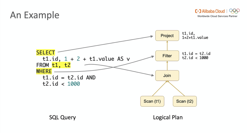 经过上述操作后得到了一个树状结构的逻辑执行计划,根节点对应最上层的 Select 语句,叶子节点对应输入表 t1 和 t2 的 TableScan 操作,Join 和 Where 条件过滤 分别对应了 Join 和 Filter 节点。LogicalProject(id=[$0], v=[+(+(1, 2), $1)])