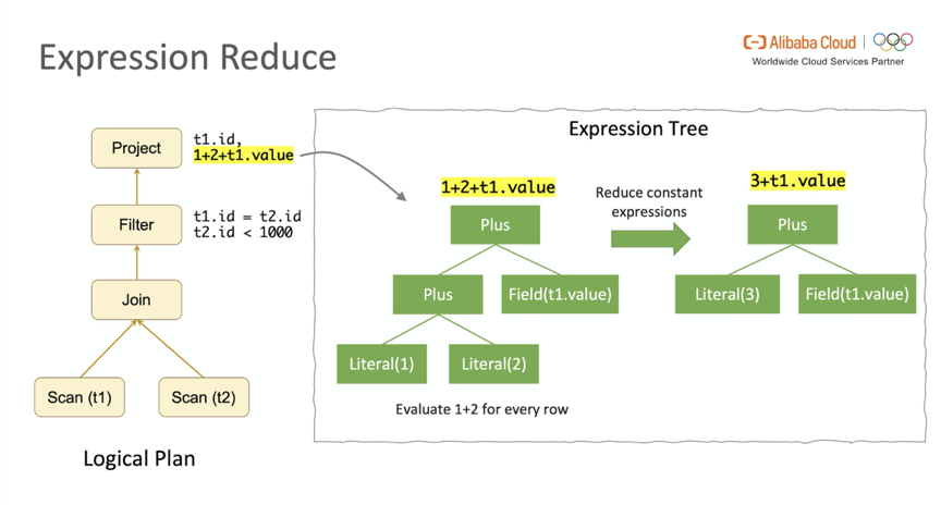 下面开始介绍 Flink SQL 优化器常见的几种优化方式。■ 2.1.1 Expression Reduce表达式(Expression) 是 SQL 中最常见的语法。比如 t1.id 是一个表达式, 1 + 2 + t1.value 也是一个表达式。优化器在优化过程中会递归遍历树上节点,尽可能预计算出每个表达式的值,这个过程就称为表达式折叠。这种转换在逻辑上等价,通过优化后,真正执行时不再需要为每一条记录都计算一遍 1 + 2。