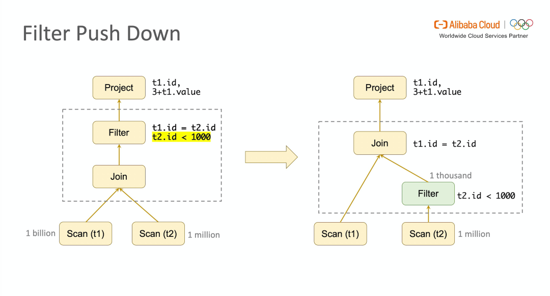 ■ 2.1.2 PushDown Optimization下推优化是指在保持关系代数语义不变的前提下将 SQL 语句中的变换操作尽可能下推到靠近数据源的位置以获得更优的性能,常见的下推优化有谓词下推(Predicate Pushdown),投影下推(Projection Pushdown,有时也译作列裁剪)等。回顾 E.g.1,我们发现 WHERE 条件表达式中 t2.id < 1000 这个过滤条件描述的是对表 t2 的约束,跟表 t1 无关,完全可以下推到 JOIN 操作之前完成。假设表 t2 中有一百万行数据,但是满足 id < 1000 的数据只有 1,000 条,则通过谓词下推优化后到达 JOIN 节点的数据量降低了1,000 倍,极大地节省了 I O 开销,提升了 JOIN 性能。
