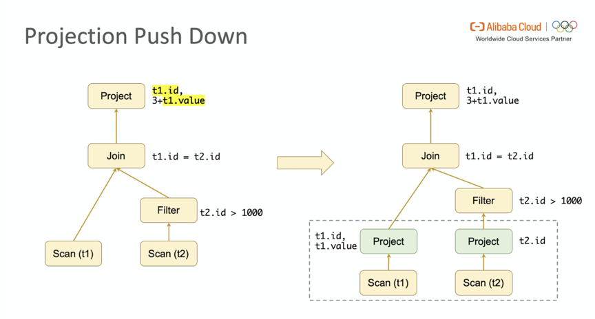 回顾 E.g.1,我们发现整个查询中只用到了表 t1 的 id 和 value 字段,表 t2 的 id 字段,在 TableScan 节点之上分别增加 Projection 节点去掉多余字段,极大地节省了 I O 开销。