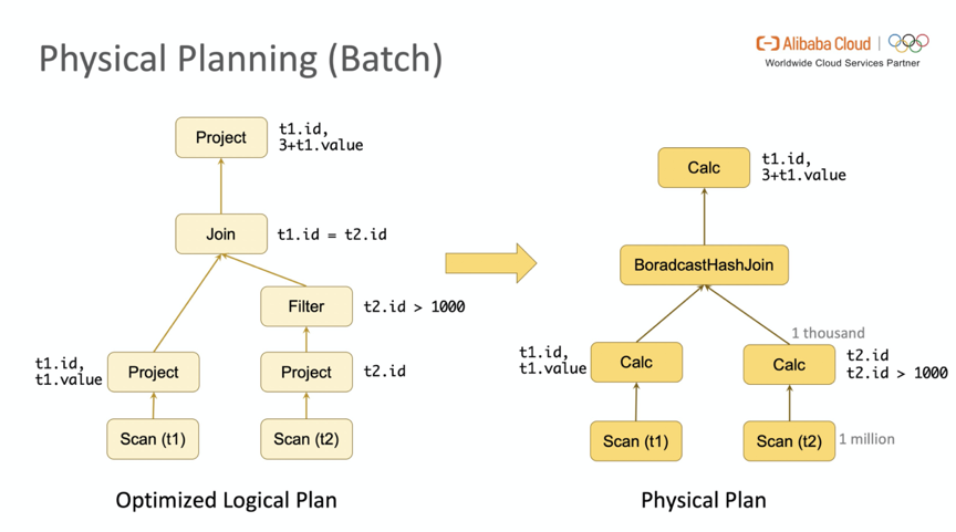简要总结一下,谓词下推和投影下推分别通过避免处理不必要的记录数和字段数来降低 I O 开销提升性能。2.2 Physical Planning on Batch通过上述一系列操作后,我们得到了优化后的逻辑执行计划。逻辑执行计划描述了执行步骤和每一步需要完成的操作,但没有描述操作的具体实现方式。而物理执行计划会考虑物理实现的特性,生成每一个操作的具体实现方式。比如 Join 是使用 SortMergeJoin、HashJoin 或 BroadcastHashJoin 等。优化器在生成逻辑执行计划时会计算整棵树上每一个节点的 Cost,对于有多种实现方式的节点(比如 Join 节点),优化器会展开所有可能的 Join 方式分别计算。最终整条路径上 Cost 最小的实现方式就被选中成为 Final Physical Plan。回顾 E.g.1,当它以批模式执行,同时我们可以拿到输入表的 Statistics 信息。在经过前述优化后,表 t2 到达 Join 节点时只有 1,000 条数据,使用 BroadcastJoin 的开销相对最低,则最终的 Physical Plan 如下图所示。