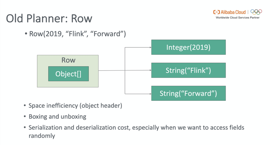 前面介绍了 Flink SQL 引擎的工作原理,接下来会简要概括一下 Flink SQL 内部的一些优化,更多资料可以在 Flink Forward Asia 2019 查看。在 Flink 1.9+ 前, Flink Runtime 层各算子间传递的数据结构是 Row,其内部实现是 Object[]。这种数据结构的问题在于不但需要额外开销存 Object Metadata,计算过程中还涉及到大量序列化 反序列 (特别是只需要处理某几个字段时需要反序列化整个 Row),primitive 类型的拆 装箱等,都会带来大量额外的性能开销。
