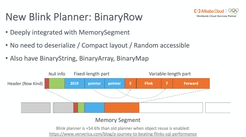 Flink 1.9 开始引入了 Blink Planner,使用二进制数据结构的 BinaryRow 来表示 Record。BinaryRow 作用于默认大小为 32K 的 Memory Segment,直接映射到内存。BinaryRow 内部分为 Header,定长区和变长区。Header 用于存储 Retraction 消息的标识,定长区使用 8 个 bytes 来记录字段的 Nullable 信息及所有 primitive 和可以在 8 个 bytes 内表示的类型。其它类型会按照基于起始位置的 offset 存放在变长区。BinaryRow 作为 Blink Planner 的基础数据结构,带来的好处是显而易见的:首先存储上更为紧凑,去掉了额外开销;其次在序列化和反序列化上带来的显著性能提升,可根据 offset 只反序列化需要的字段,在开启 Object Reuse 后,序列化可以直接通过内存拷贝完成。