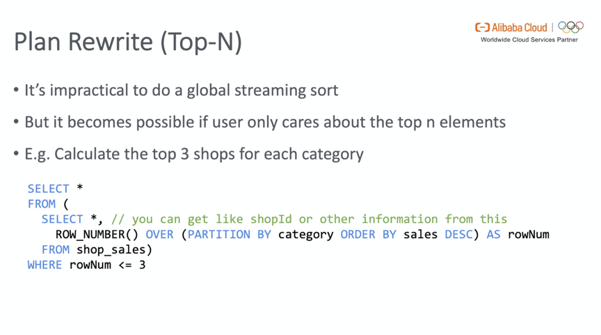 全局排序在流式的场景是很难实现的,但如果只需要计算到目前的 Top-N 极值,问题就变得可解。不过传统数据库求排序的 SQL 语法是通过 ORDER BY 加 LIMIT 限制条数,背后实现的机制也是通过扫描全表排序后再返回 LIMIT 条数的记录。另外如果按照某些字段开窗排序,ORDER BY 也无法满足要求。Flink SQL 借鉴了批场景下开窗求 Top-N 的语法,使用 ROW_NUMBER 语法来做流场景下的 Top-N 排序。E.g.3 下面这段 SQL 计算了每个类目下销量 Top3 的店铺SELECT*