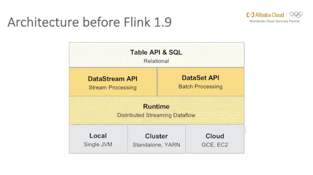 要想了解 Flink SQL 在1.9 版本引入新架构的动机,我们首先看下 1.9 版本之前的架构设计。