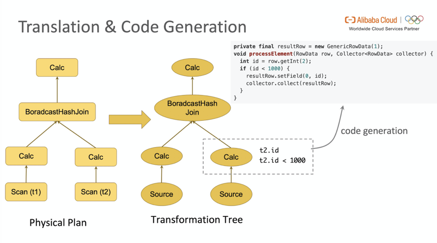 2.3 Translation & Code Generation代码生成(Code Generation) 在计算机领域是一种广泛使用的技术。在 Physical Plan 到生成 Transformation Tree 过程中就使用了 Code Generation。回顾 E.g.1,以 表 t2 之上的 Calc 节点 t2.id < 1000 表达式为例,通过 Code Generation 后生成了描述 Transformation Operator 的一段 Java 代码,将接收到的 Row 中 id < 1000 的 Row 发送到下一个 Operator。