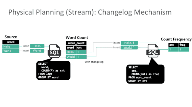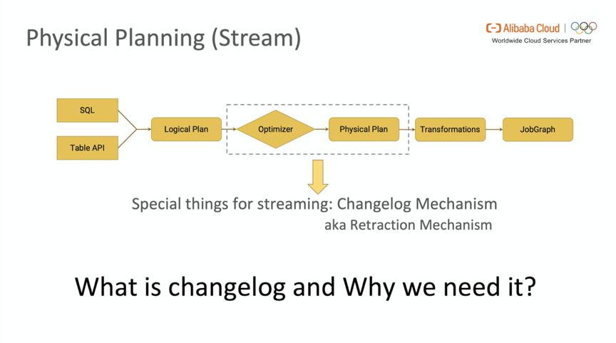2.4 Physical Planning on Stream以上介绍了 Flink SQL 引擎的整体工作流,上述例子是假定以批模式编译的,下面我们来介绍一下以流模式编译时,在生成 Physical Plan 过程中的一个重要机制:Retraction Mechanism (aka. Changelog Mechanism)。