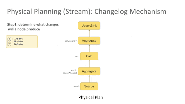 update_before 是一条非常关键的信息,相当于标记出了导致当前结果不正确的那个“元凶”。不过额外操作会带来额外的开销,有些情况下不需要发送 update_before 也可以获得正确的结果,比如下游节点接的是 UpsertSink(MySQL 或者 HBase的情况下,数据库可以按主键用 update_after 消息覆盖结果)。是否发送 update_before 由优化器决定,用户不需要关心。■ 2.4.2 Update_before Decision前面介绍了 Retraction 机制和 update_before,那优化器是怎样决定是否需要发送update_before 呢?本节将介绍这一部分的工作。Step1:确定每个节点对应的 Changelog 变更类型数据库中最常见的三种操作类型分别是 Insert (记为 [I]),Delete(记为 [D]),Update(记为 [U])。优化器首先会自底向上检查每个节点,判断它属于哪(几)种类型,分别打上对应标记。回顾 E.g.2,第一个 Source 节点由于只产生新数据,所以属于 Insert,记为 [I];第二个节点计算内层的聚合,所以会发出更新的消息,记为 [I,U];第三个节点裁掉 word 字段,属于简单计算,传递了上游的变更类型,记为 [I,U];第四个节点是外层的聚合计算,由于它收到了来自上游的 Update 消息,所以额外需要 Delete 操作来保证更新成功,记为 [I,U,D]。