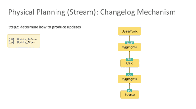 在介绍 Step2 之前,我们先介绍下 Flink 中 Update 消息类型的表示形式。在 Flink 中 Update 由两条 update_before(简称 UB)和 update_after (简称 UA)来表示,其中 UB 消息在某些情况下可以不发送,从而提高性能。在 Step1 中优化器自底向上推导出了每个节点对应的 Changelog 变更操作,这一步里会先自顶向下推断当前节点需要父节点提供的消息类型,直到遇到第一个不需要父节点提供任何消息类型的节点,再往上回推每个节点最终的实现方式和需要的消息类型。回顾 E.g.2,由于最上层节点是 UpsertSink 节点,只需要它的父节点提供 [UA] 即可。到了外层聚合的 Aggregate 节点,由于 Aggregate 节点的输入有 Update 操作,所以需要父节点需要提供 [UB,UA],这样才能正确更新自己的计算状态。再往下到 Calc 节点,它需要传递 [UB,UA] 的需求给它的父节点,也就是内层的 Aggregate 节点。而到了内层 Aggregation 节点,它的父节点是 Source 节点,不会产生 Update 操作,所以它不需要 Source 节点额外发送任何 [UB UA ]。当优化器遍历到 Source 节点,便开始进行回溯,如果当前节点能满足子节点的 requirement,则将对应的标签更新到节点上,否则便无法生成 plan。首先内层的 Aggregate 能产生 UB,所以能满足子节点的 requirement,所以优化器会给内层的 Aggregate 节点打上 [UB,UA] 的标签,然后向上传递到 Calc 节点,同样打上 [UB,UA] ,再到外层的 Aggregate 节点,由于它的下游只需要接受更新后的消息,所以打上 [UA] 标签,表示它只需要向下游发送 update_after 即可。这些标签最终会影响算子的物理实现,比如外层的 Aggregate 节点,由于它会接收到来自上游的 [UB],所以物理实现会使用带 Retract 的 Count,同时它只会向 Sink 发送 update_after。而内层的 Aggregate 节点,由于上游发送过来的数据没有 [UB],所以可以采用不带 Retract 的 Count 实现,同时由于带有 [UB] 标签,所以需要往下游发送 update_before。