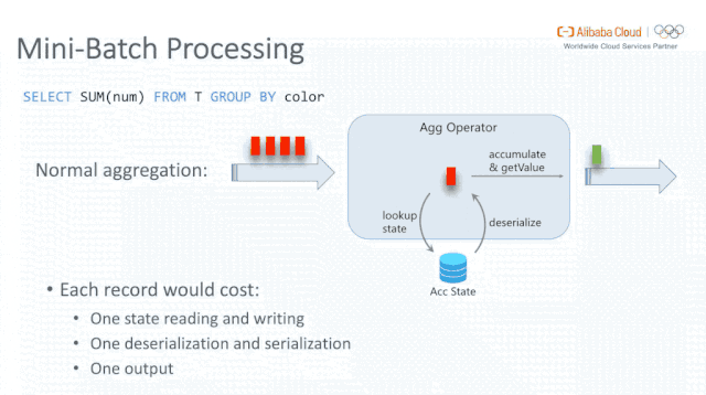 3.2 Mini-batch ProcessingFlink 是纯流式处理框架,在理论上每一条新到的数据都会触发一次计算。然而在实现层面,这样做会导致聚合场景下每处理一条数据都需要读写 State 及序列化 / 反序列化。如果能够在内存中 buffer 一定量的数据,预先做一次聚合后再更新 State,则不但会降低操作 State 的开销,还会有效减少发送到下游的数据量,提升 throughput,降低两层聚合时由 Retraction 引起的数据抖动, 这就是 Mini-batch 攒批优化的核心思想。