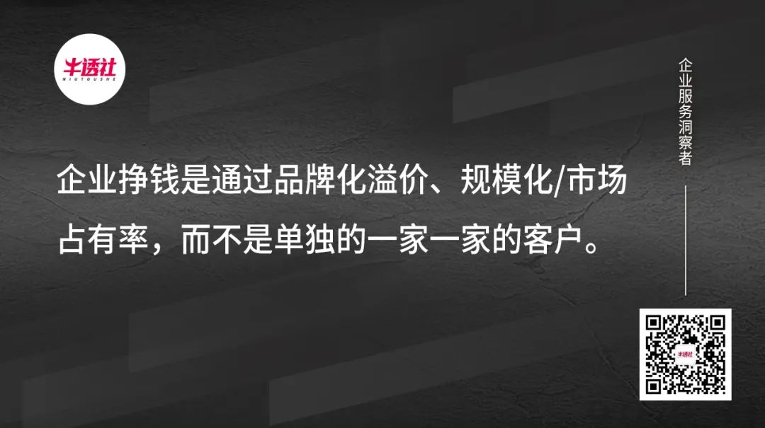 企业挣钱是通过品牌化溢价、规模化/市场占有率,而不是单独的一家一家的客户。