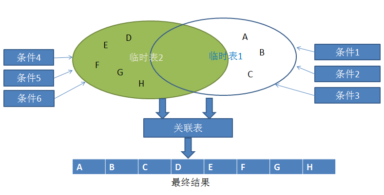以此类推,可以建立多个临时表,将查询条件汇总。