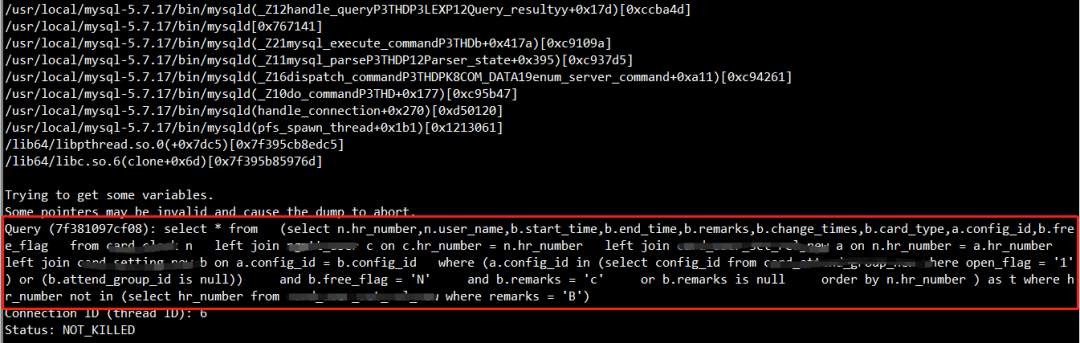一MySQL-5.7.17测试环境,业务发出一条查询sql语句后,直接引起数据库的宕机,查看err日志,发现sql语句如下: