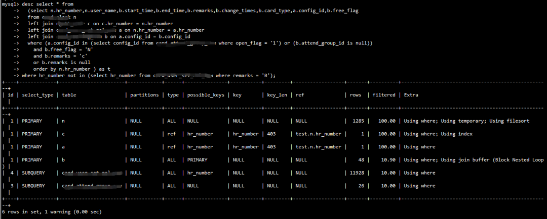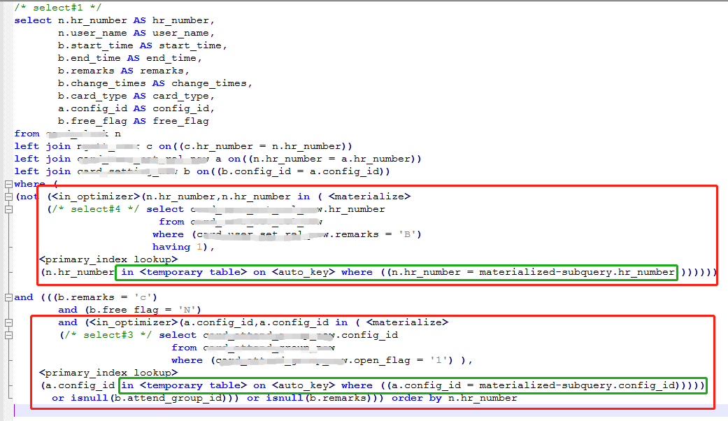 该sql语句被MySQL进行了重写,并且两个子查询都使用了物化子查询进行了优化,分配两个临时表用于存放子查询的结果,并且为每个临时表创建hashindex,用于关联其它表时,提高效率。