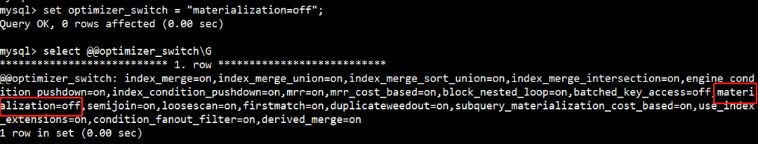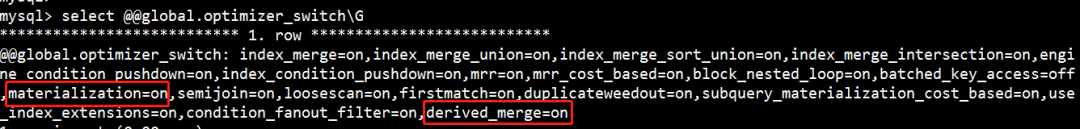 “materialization=on”表明启用物化子查询功能,”derived_merge=on”表明改写sql,将子查询合并至外部语句。难道是物化子查询这个功能引起的吗?