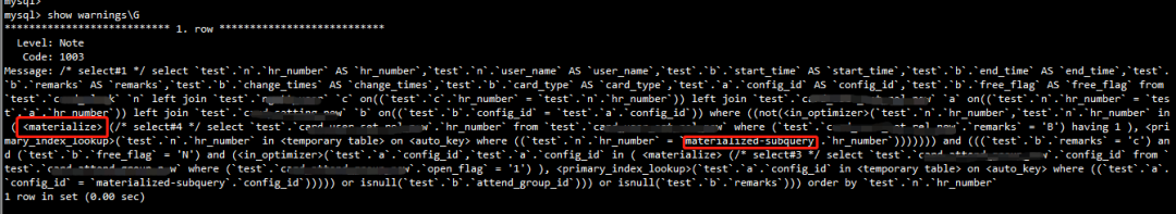 执行计划相对简单,值得注意的是select_type为“SUBQUERY”,它表明该sql可能使用了物化子查询功能,为了得到确切的信息,查看warning信息: