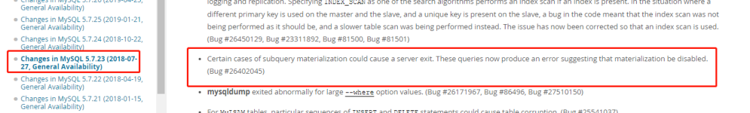 上述bug说明,物化子查询可能会导致mysql服务宕机,5.7.23及以上版本修复了该问题,运行这样的sql语句将会报错,而不会再导致mysql宕机。