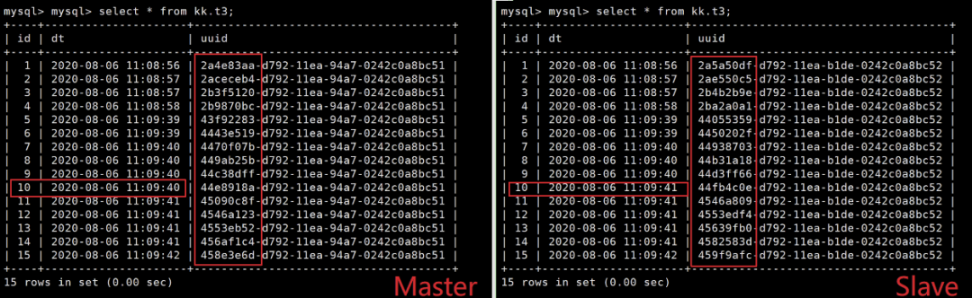 会发现主从节点发生了数据不一致的情况:id=10的时间不一致,而uuid列则完全不一致。