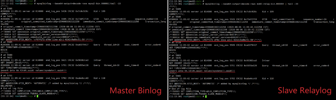 分析binlog和relay-log,可以看到,statement格式的binlog中记录的是完整的SQL,这样在执行一些不可控结果的函数时,二者肯定不一致。