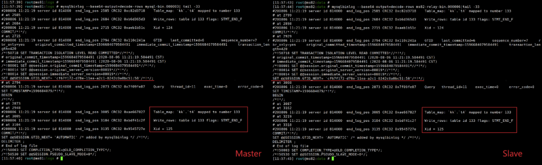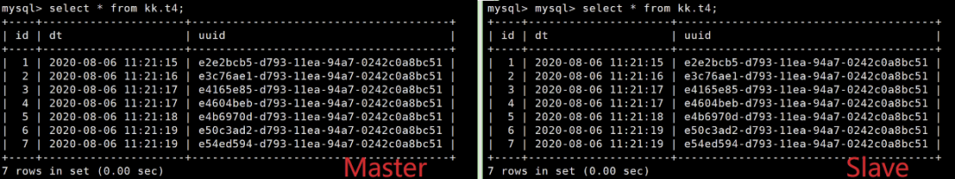 # 环境信息:# mysql 8.0.19,一主一从异步复制架构。# 修改master的binlog_format为statement。(这个实验里无需调整slave的binlog_format,想想看为什么?)mysql-master> set binlog_format=statement;Query OK, 0 rows affected (0.00 sec)# binlog_format参数支持session和global级别,别晕。mysql-master> show global variables like "%binlog_format%";+---------------+-------+| Variable_name | Value |+---------------+-------+| binlog_format | ROW |+---------------+-------+1 row in set (0.01 sec)# binlog_format参数支持session和global级别,别晕。mysql-master> show variables like "%binlog_format%";+---------------+-----------+| Variable_name | Value |+---------------+-----------+| binlog_format | STATEMENT |+---------------+-----------+1 row in set (0.01 sec)# 建库建表用来实验。mysql-master> create database kk;Query OK, 1 row affected (0.30 sec)mysql-master> create table kk.t3 (id int auto_increment primary key,dt varcharQuery OK, 0 rows affected (0.74 sec)# uuid() 函数会随机生成UUID,mysql-master> insert into kk.t3(dt,uuid) values(sysdate(),uuid());Query OK, 1 row affected, 1 warning (0.08 sec)#重复插入若干次