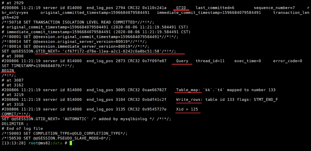 # 建立一个新表用来测试mysql-master> create table kk.t4 like kk.t3;Query OK, 0 rows affected (0.96 sec)# 调整binlog格式为rowmysql-master> set binlog_format=row;Query OK, 0 rows affected (0.00 sec)# 切换一下日志,便于后面分析mysql-master> flush logs;Query OK, 0 rows affected (0.25 sec)# 插入若干次数据mysql-master> insert into kk.t4(dt,uuid) values(sysdate(),uuid());Query OK, 1 row affected (0.06 sec)