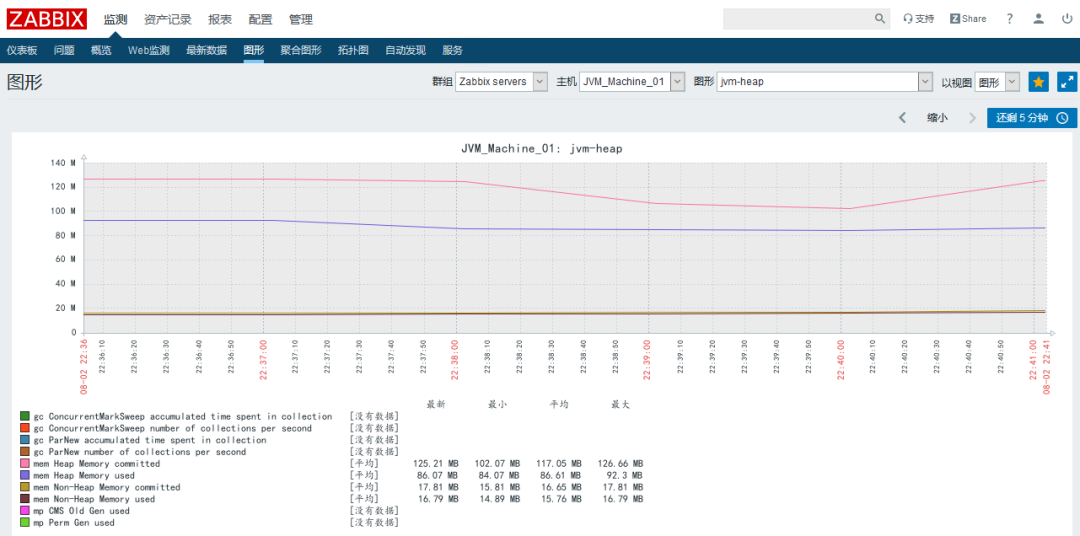 JVM:GC 次数、GC 耗时、各个内存区域的大小、当前线程数、死锁线程数。