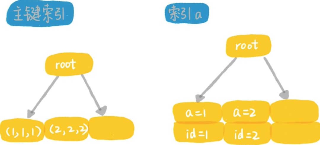 我们都知道,InnoDB是索引组织表,所有的数据都是存储在索引树上面的。比如上面的表t,这个表包含了两个索引,一个主键索引和一个普通索引。在InnoDB里,数据是放在主键索引里的。如图所示: