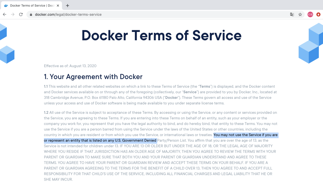所以暂时来讲,开源的 Docker 软件并不受该禁令限制。