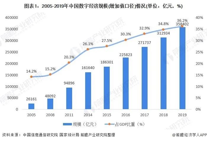 在当今全球经济都在逐渐向数字化转型的时代,我国也将数字经济的发展作为国家发展战略。伴随着数字经济与实体经济的逐渐融合,我国数字经济发展迅速。据中国信息通信研究院数据显示,我国数字经济增加值规模由2005年的2.6万亿元增加至2019年的35.8万亿元。与此同时,数字经济在GDP所占的比重逐年提升,由2005年的14.2%提升至2019年的36.2%。